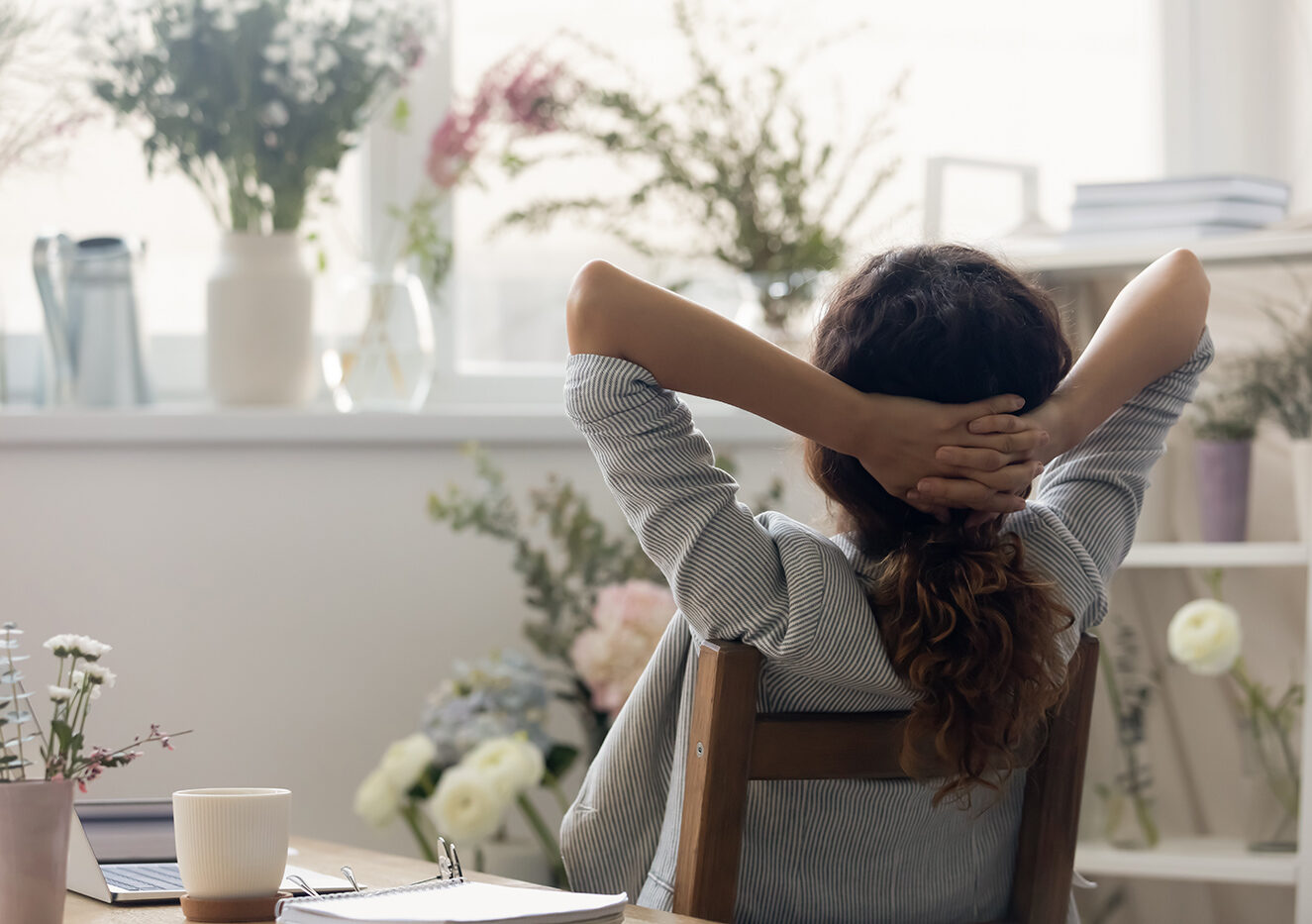 Frau sitzt entspannt mit verschränkten Armen auf einem Stuhl, umgeben von Pflanzen – steht für Reflexion und individuelles Coaching.